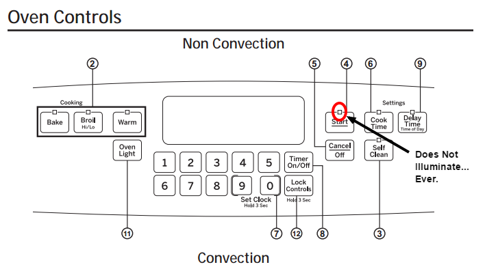 Per GE Techline the engineers omitted the L.E.D from the control PCB. So basically even though the display shows a place for the L.E.D indicator there is no L.E.D. installed. So if your new GE Range doesn’t show the Start Button indicator, it is working normally.